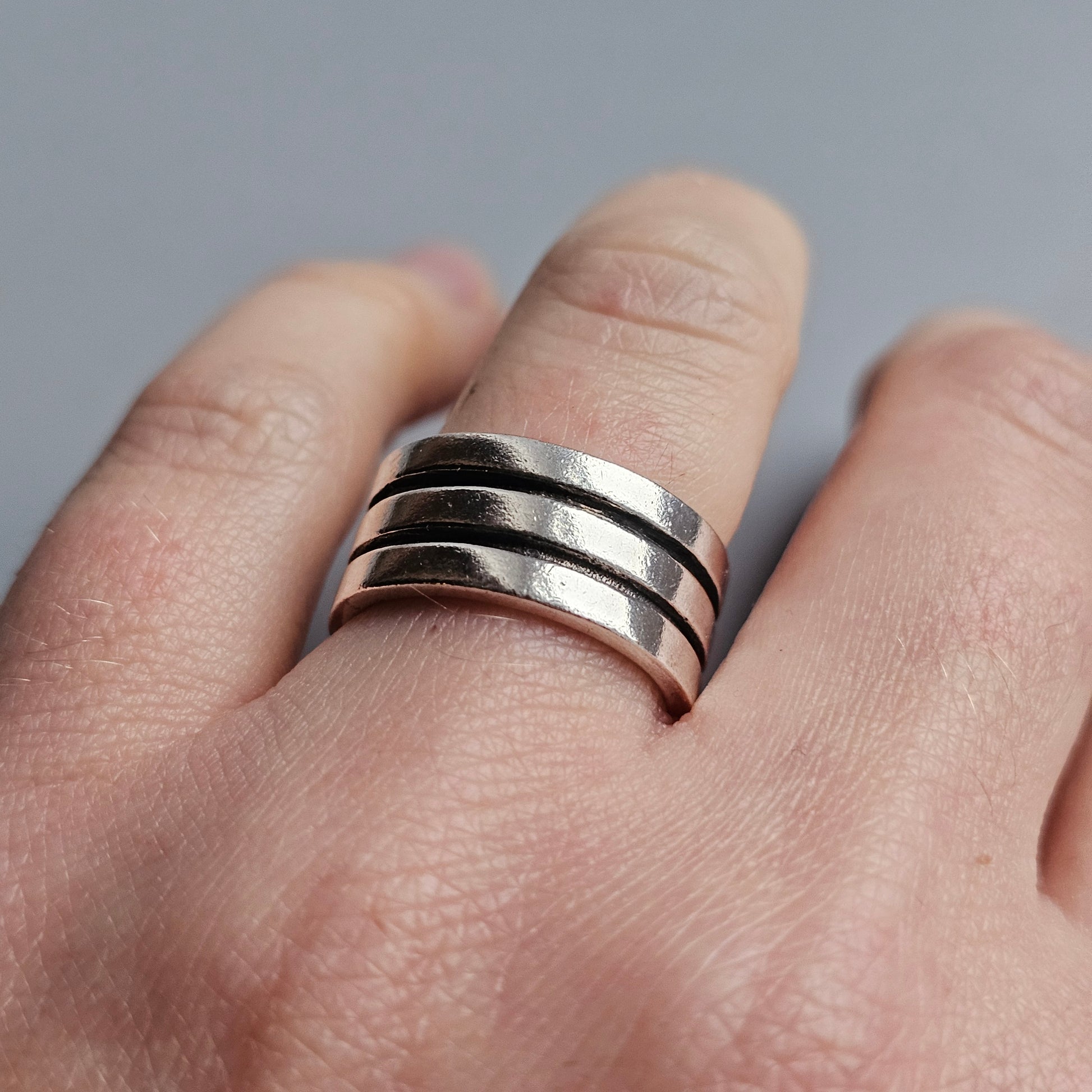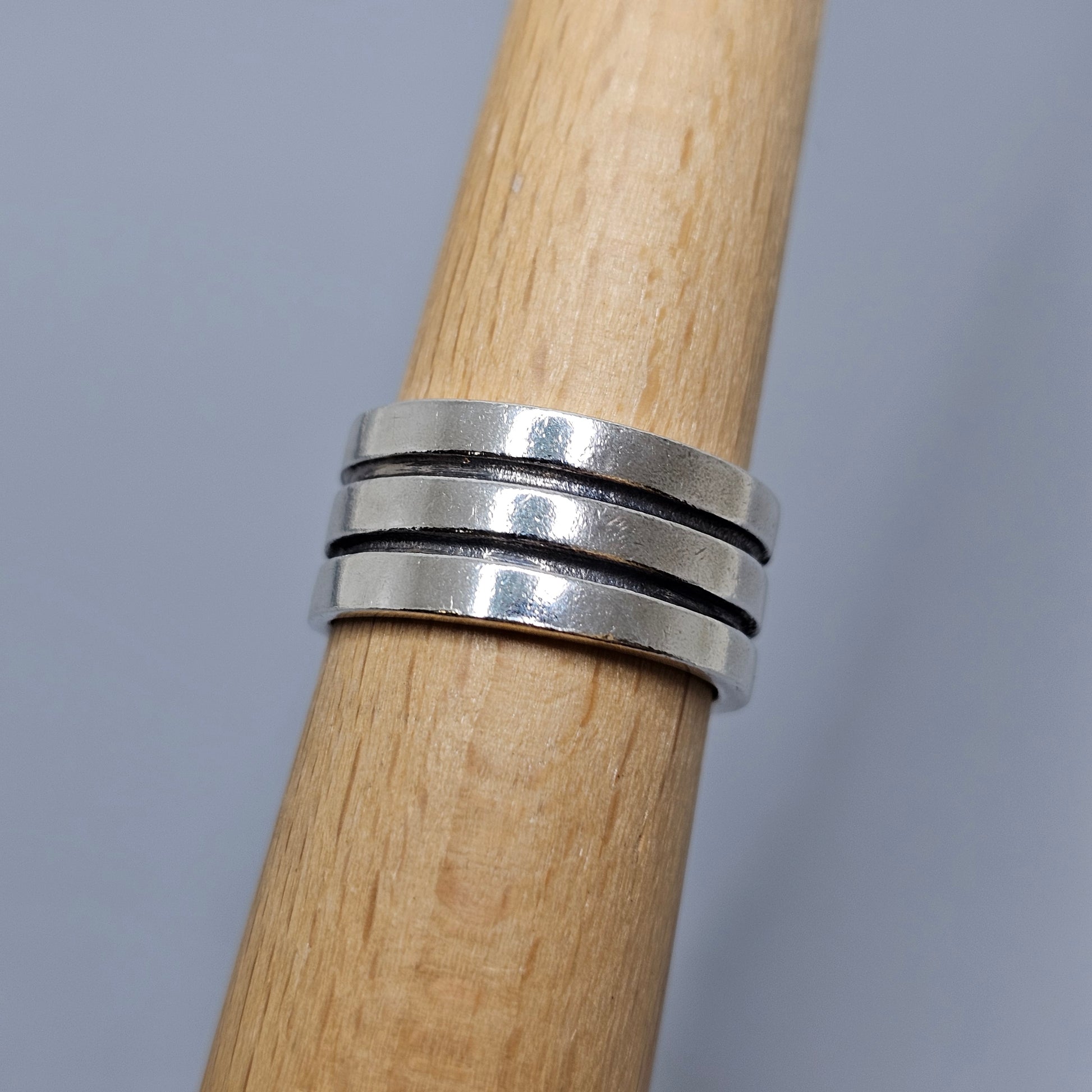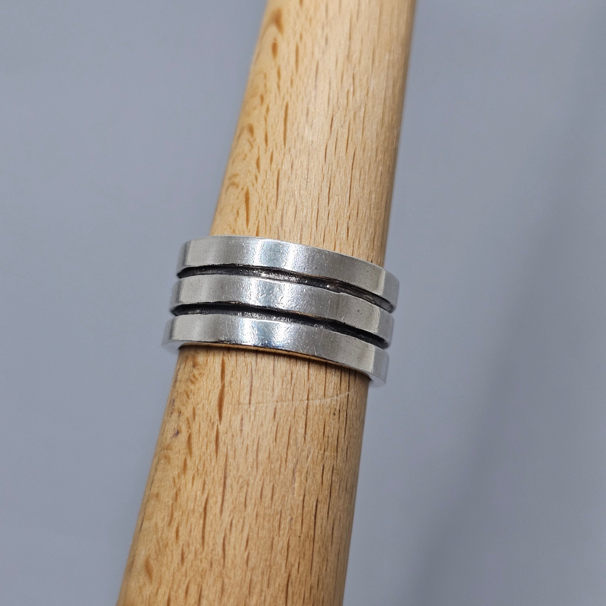 A sleek vintage Finnish silver ring featuring a bold triple-band design. Understated yet striking, this piece captures the clean lines and refined craftsmanship associated with Finnish modern jewellery.