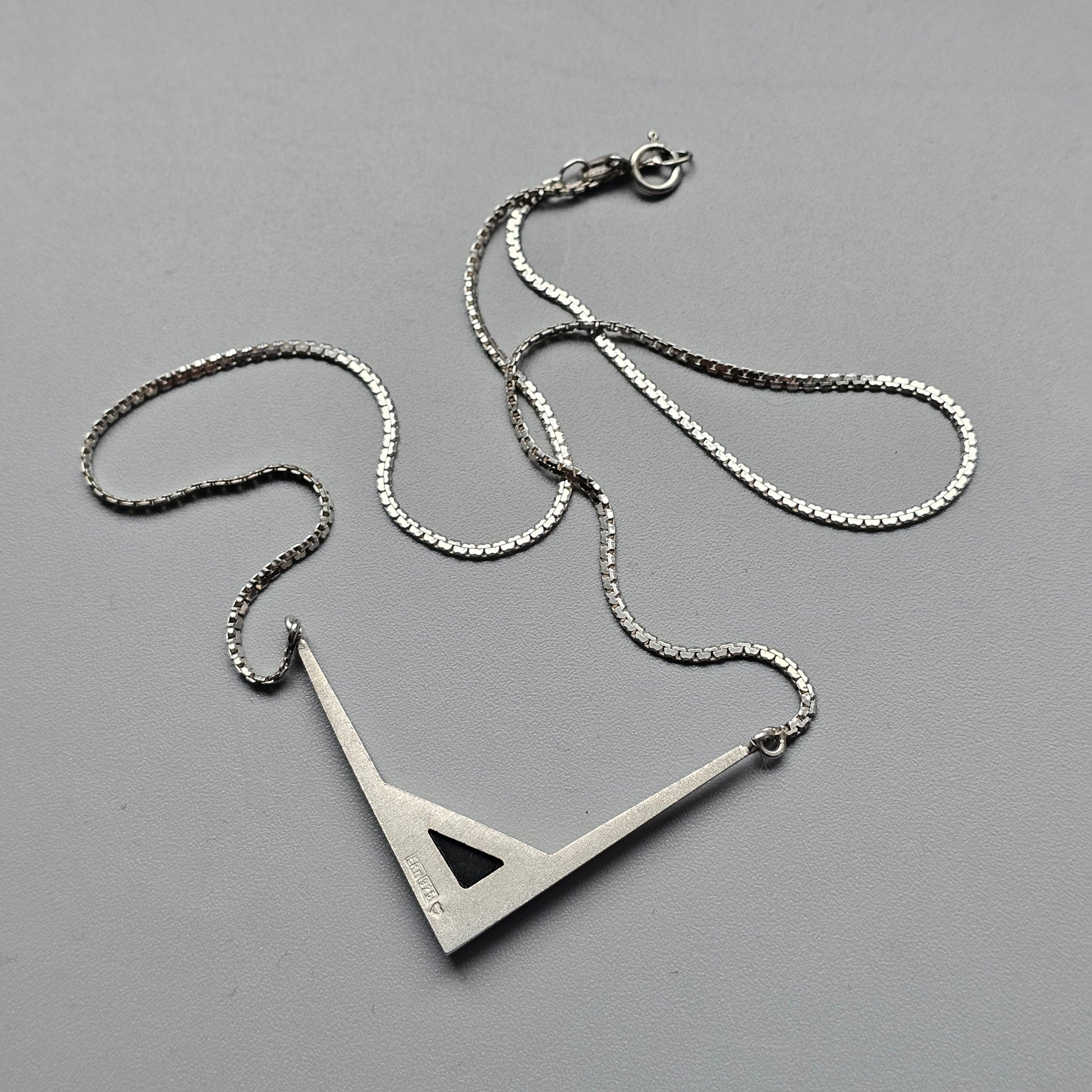 A geometric silver necklace with a minimalist angular pendant, featuring a black onyx inlay set within a sharp V-shaped form. The design has a clean, architectural feel typical of late 20th-century Finnish jewellery. The silver has a smooth matte finish, contrasting with the polished depth of the stone.