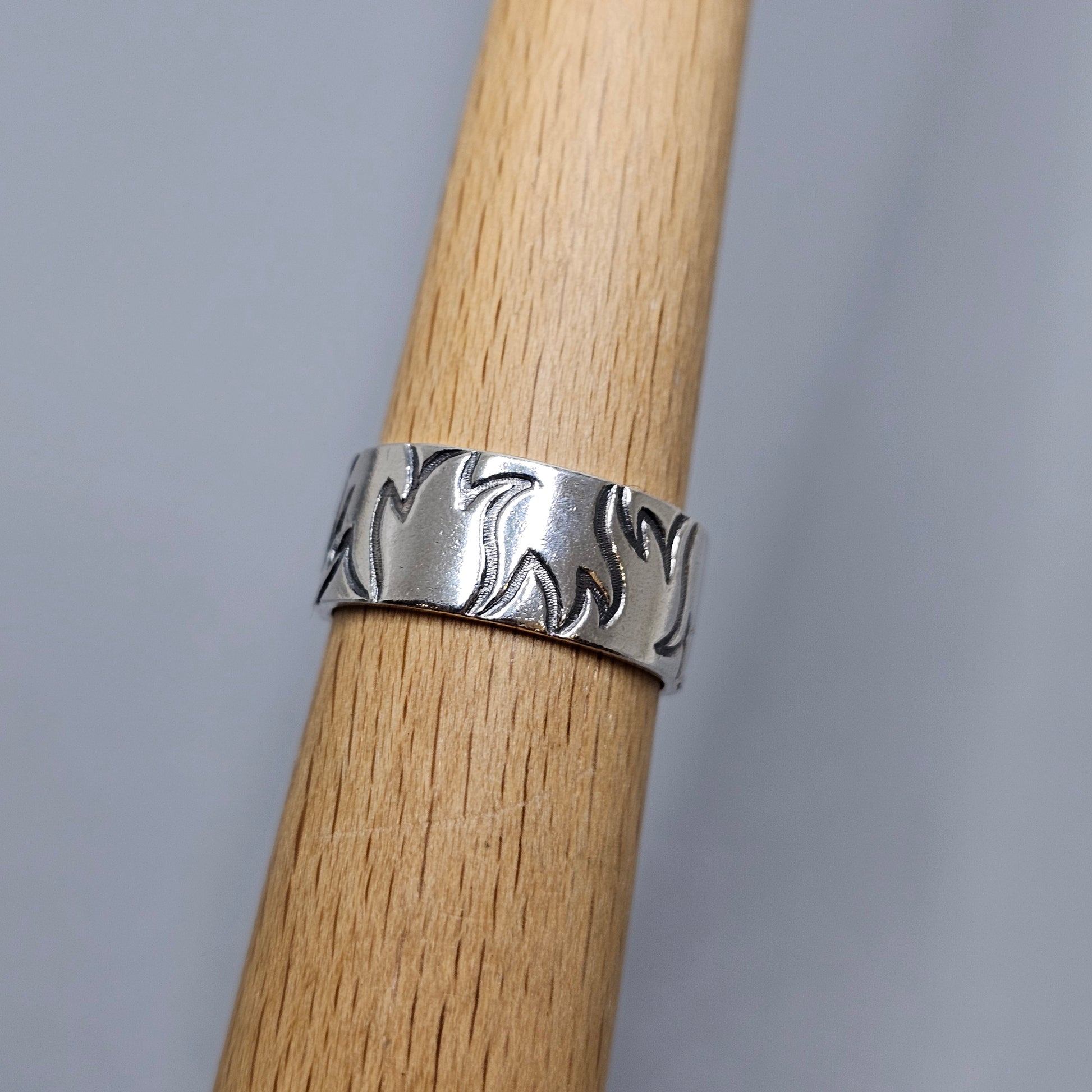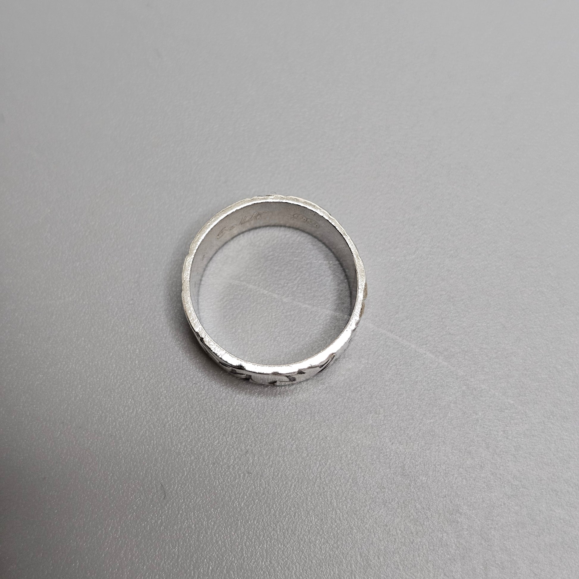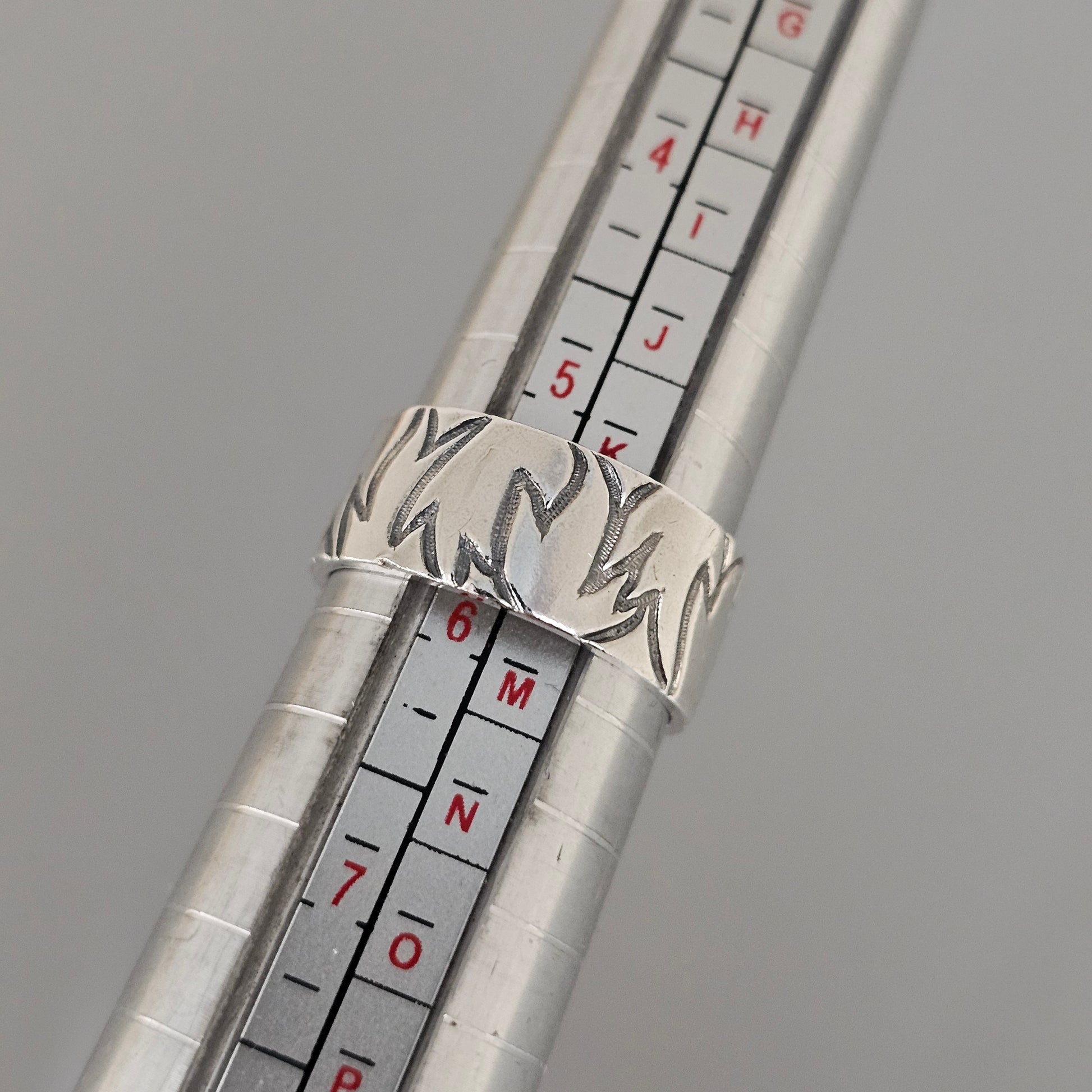 A charming vintage Finnish silver bandf eaturing an elegant repeating leaf-style pattern with a subtle mid century influence, this ring blends simplicity with decorative detail — a classic example of mid-century Finnish jewellery craftsmanship.