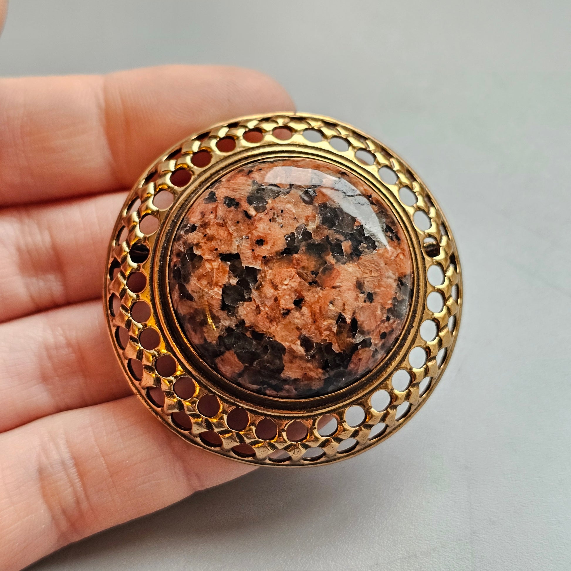 A striking vintage brooch by Kalevala Koru, featuring a polished cabochon of natural Finnish granite set within an intricate bronze surround. The openwork border takes inspiration from a historical ring brooch discovered in Inari, Northern Finland — a region rich in ancient Sámi and Finnish cultural heritage.