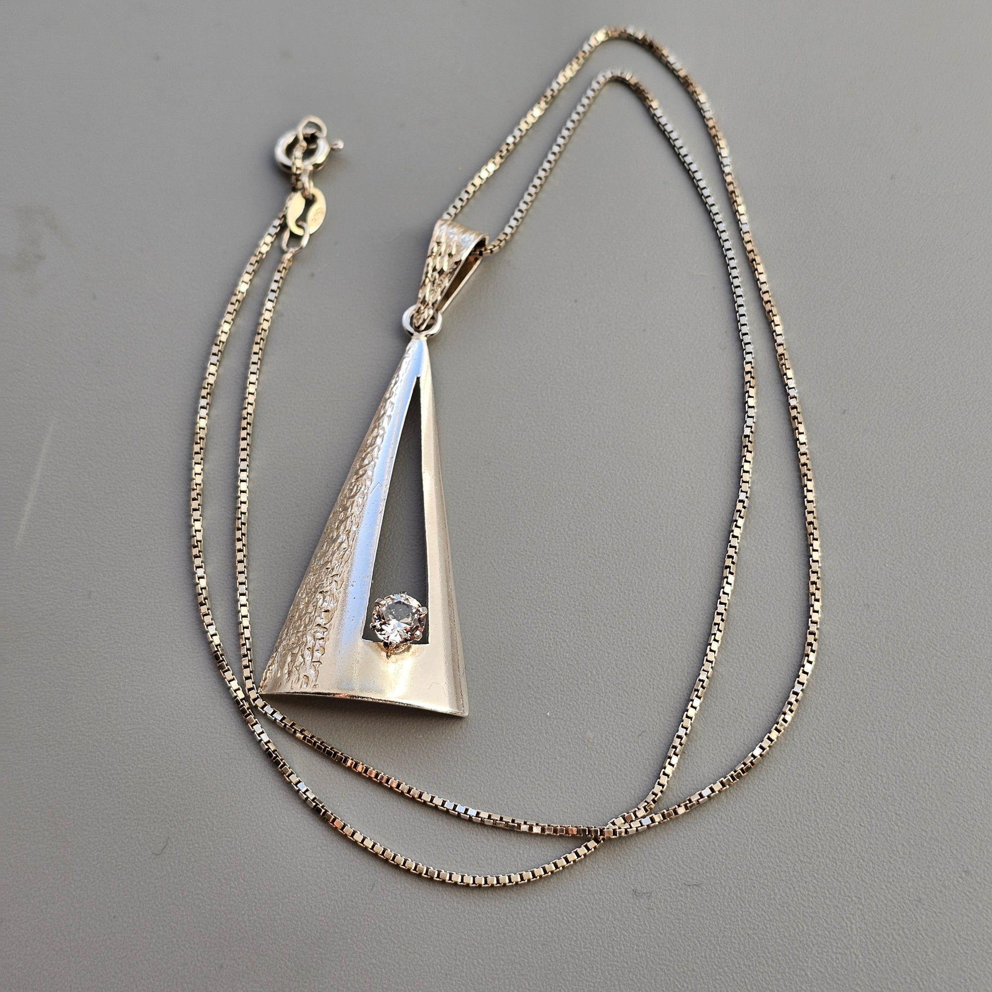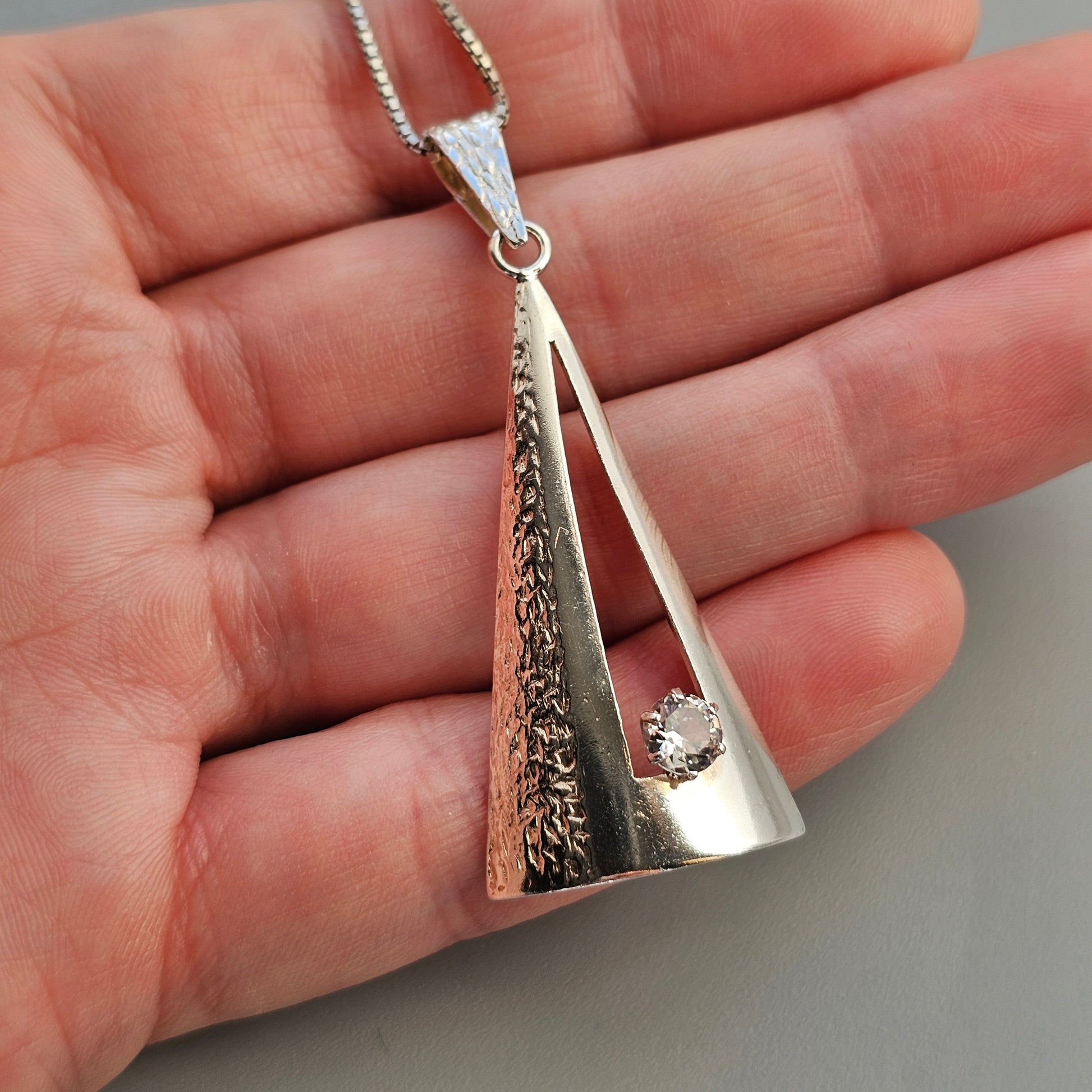 A sculptural Finnish silver pendant by Edvard Kinni, dating to the late 1960s–early 1970s. The design features a tapered open-frame form with contrasting surfaces — one side smooth and polished, the other textured. A clear faceted rock crystal sits securely within the lower cut-out section, catching the light when worn.