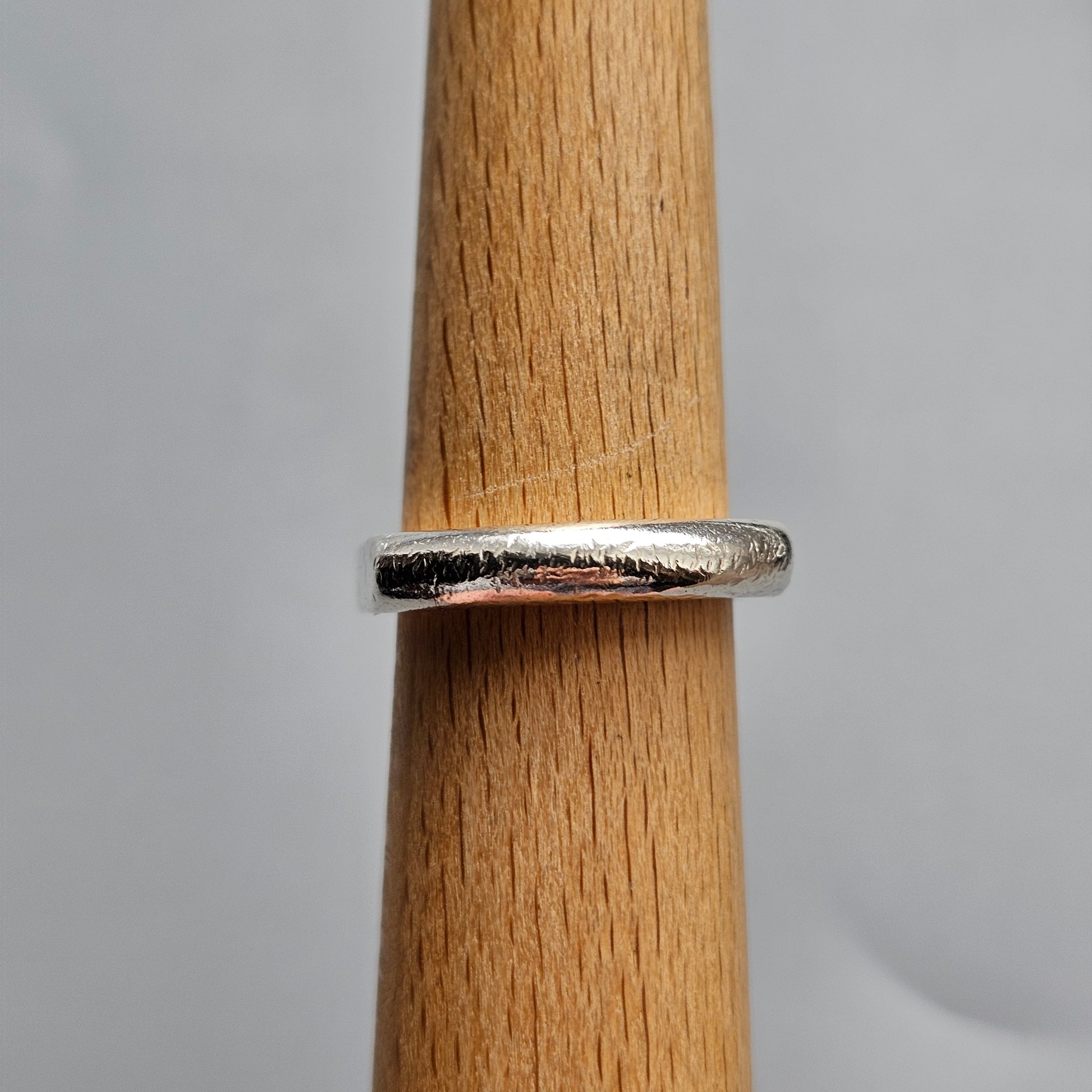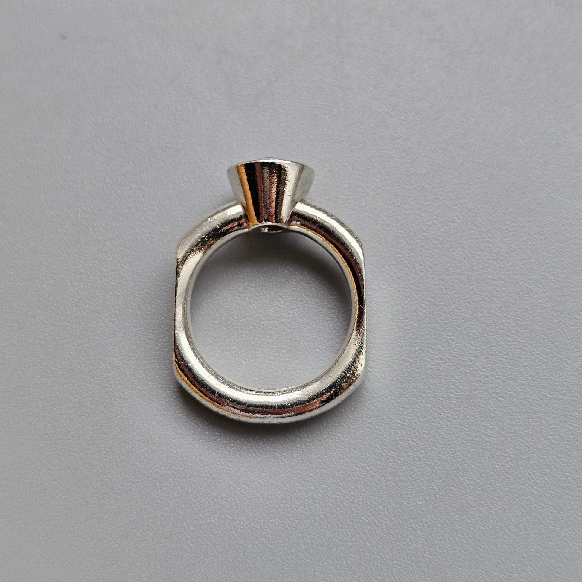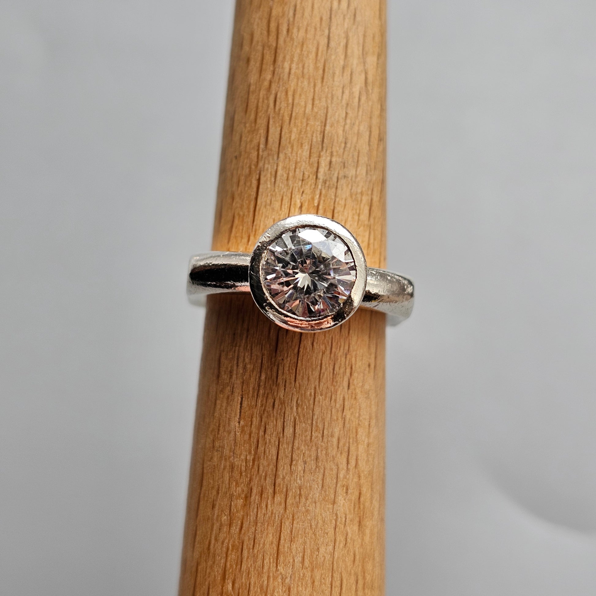 This early 2000s sterling silver ring features a clear cubic zirconia set in a smooth, raised bezel mount. The setting sits slightly elevated from the band, allowing light to reflect through the stone. The stone has a bright, clean appearance and is securely held.